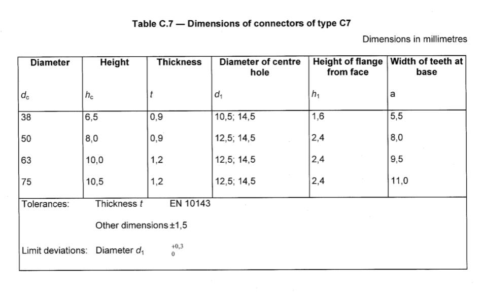 A toothed-plate connector of type C7 (see Figure C.7) is a single-sided connector made of a circular plate witha bolt-hole through the centre. Two nail holes may be drilled midway between the centre and thecircumference and on opposite sides of the bolt-hole. The edges of the plate are cut and bent over to form12 triangular teeth spaced evenly around the perimeter and projecting from one face at 90° to the face.Around the bolt-hole there is a flange projecting from the same face as the teeth. The dimensions shall complywith Table C.7.