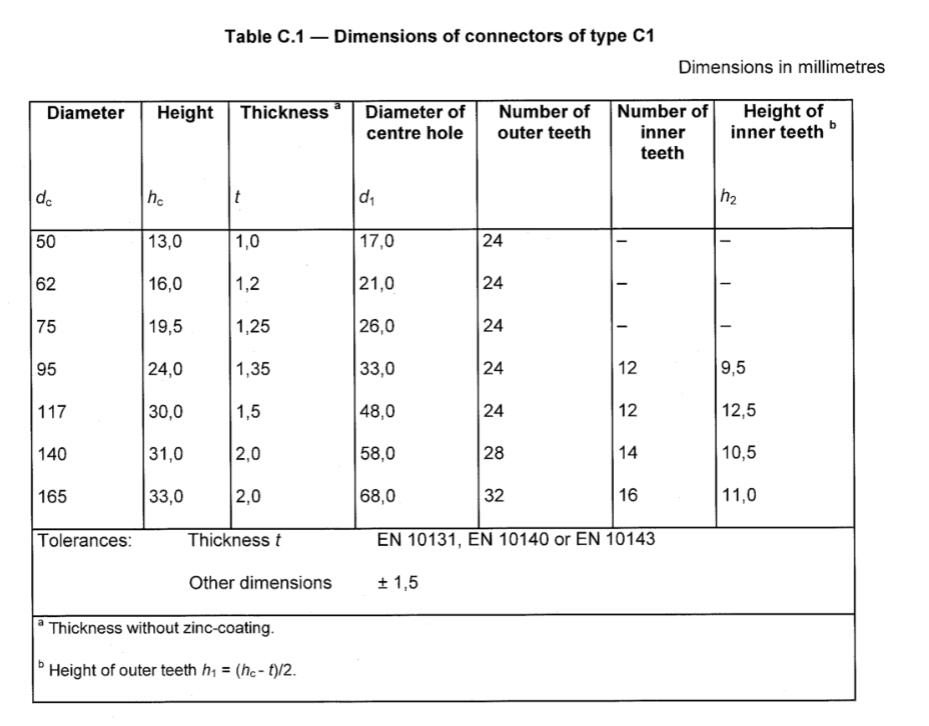 A toothed-plate connector of type C1 (see Figure C.1) is a double- sided connector made of a circular plate,the edges of which shall be cut and bent over to form triangular teeth projecting alternately from opposite faces at 90 degree to the faces. The teeth shall be evenly spaced around the perimeter of the plate and, for connectors with diameter dc >=95 mm, around the perimeter of the bolt-hole in the centre of the plate. Each plate has two nail holes between the centre of the plate and the circumference and on opposite sides of thebolt-hole. The dimensions shall comply with Table C.1.