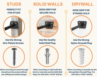 FSB-D | 4x Brackets 8x Long Screws for Wall 8x Short Screw for Shelf 8x Drywall Anchors 8x Brick/Concrete Anchors | FSB-I | 4x Brackets 12x Screws for Wall 12x Drywall Anchors 12x Brick/Concrete Anchors |