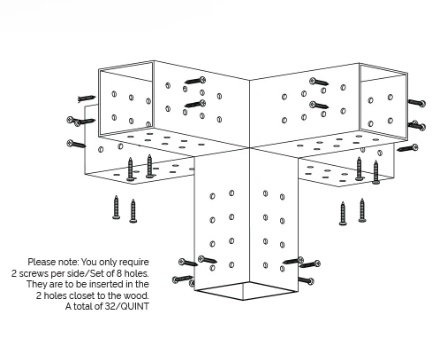 5 Arm Pergola Structure Extension Bracket for 4x4 Wood Posts | for 4”x4” Wood Posts Overall Size (1 Pc. QUAD): LxWxH: 17.75 x 10.75 x 10.75” Colour: Black Weight (2 QUAD + 2 SOLO): 27 lbs. Fastening Holes: 0.25” | |||