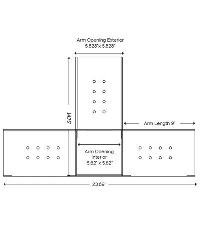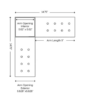 for 6”x6” Wood Posts Arm Opening (Interior): 5.62” x 5.62” Arm Opening (Exterior): 5.828” x 5.828” Arm Height: 6” Gauge: 12-gauge Steel | |||
