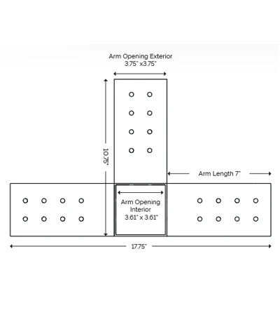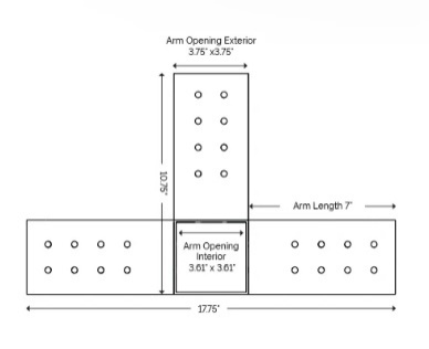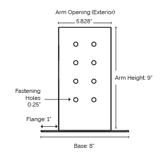 for 2”x8” Wood Posts Arm Opening (Interior): 1.61” x 7.36” Arm Opening (Exterior): 2.75” x 7.5” Gauge: 12-gauge Steel |