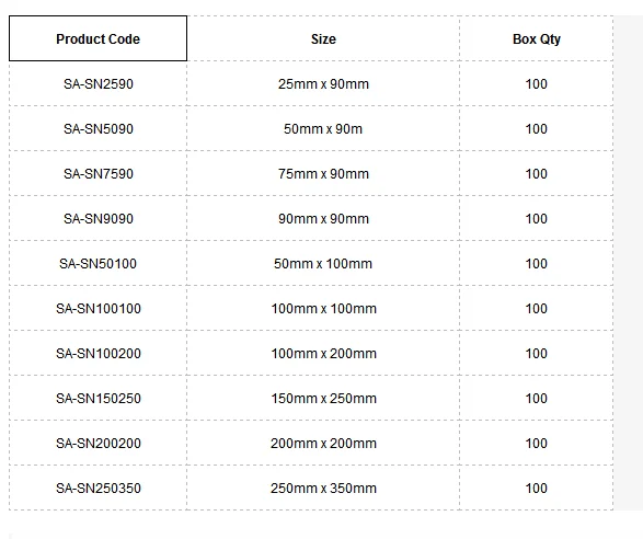 Available in the following sizes: